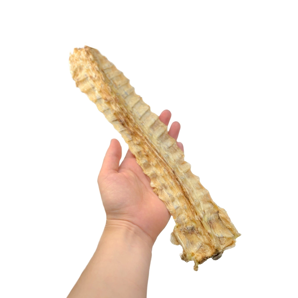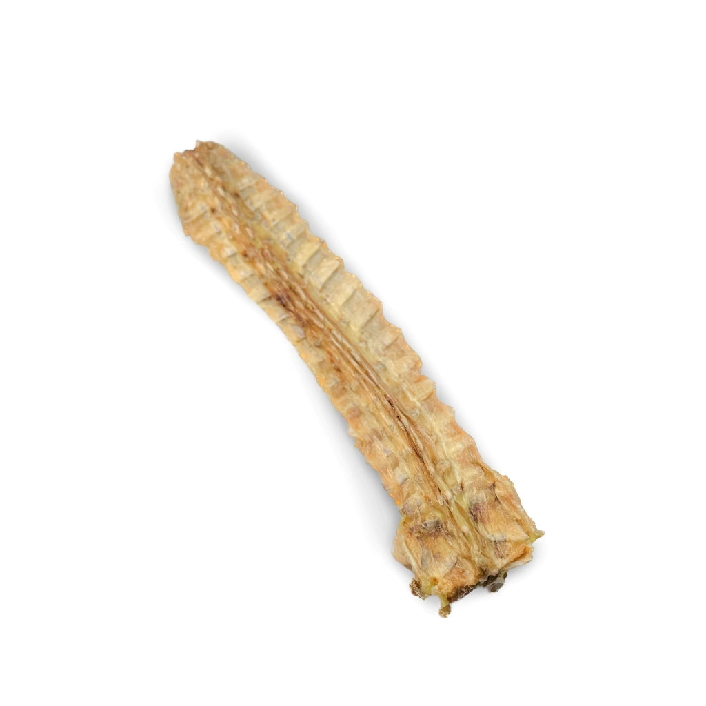 Este mastigável, de baixa rigidez, possui uma aparência impactante, pois é feito a partir da coluna espinhal inteira do jacaré.