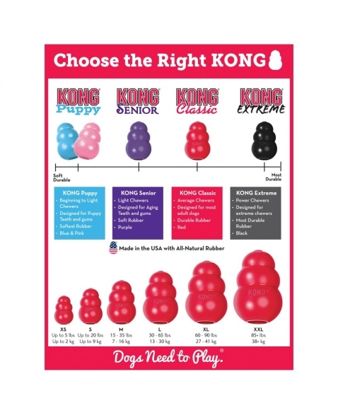 É um Brinquedo interativo que pode ser usado para brincadeiras de jogar e trazer mas principalmente para ser recheado para satisfazer necessidades primitivas dos cães que é trabalhar pelo alimento, morder e lamber. Se usado corretamente pode durar a vida toda do cão. Pode ser congelado para desafios ainda mais interessantes e duradouros. Um cão que passa 30, 40 minutos para tirar um recheio congelado do KONG se cansa a ponto de não ter mais energia para roer e destruir coisas em sua casa. Além de ser exercício físico e mental, preenche o tempo de um cão entediado.
