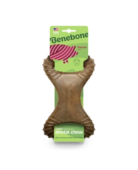 Benebone Dental Chew está disponível em 3 tamanhos e 3 sabores. Bacon, Amendoim ou Frango. Todos com apenas dois ingredientes.