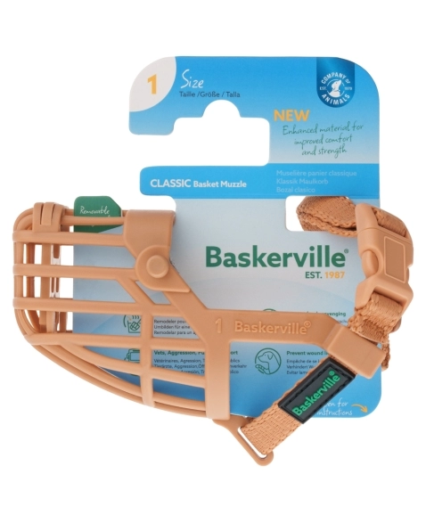 A Focinheira Clássica Baskerville foi criada usando um material aprimorado de borracha termoplástica (TPR), que é mais leve do que o design clássico de plástico, mas 4 vezes mais forte e com maior durabilidade. Esse material exclusivo permite que a focinheira seja remodelada para um ajuste personalizado em água quente. A Focinheira Baskerville Classic Basket vem com uma inserção de proteção adicional para evitar que o cão pegue alimentos e animais selvagens em caminhadas, coma pedras, coprofagia e lamba feridas após a cirurgia. O design da cesta garante o bem-estar do cão, permitindo que ele ofegue, beba e brinque. Com uma peça de nariz acolchoada aprimorada e uma alça de pescoço segura e fácil de ajustar, todos os cães podem se sentir confortáveis usando a focinheira, mantendo os donos felizes e confiantes em todas as situações. Possui, em sua ponta, um pequeno painel deslizante que deve ser deixado na focinheira para evitar que o cão coma algo indevido, durante um passeio ou no ambiente que fica, ataque pequenos animais ou consiga comer fezes. Caso este não seja o problema do cão, basta empurrar para trás e deslizar para cima e remover este painel. Isso permitirá que o cão coma alimentos e petiscos.