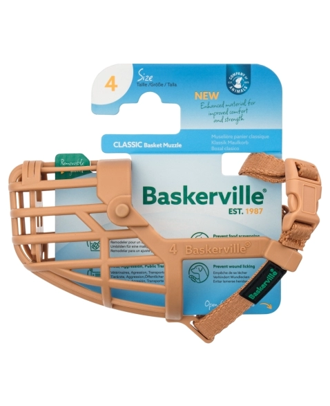A Focinheira Clássica Baskerville foi criada usando um material aprimorado de borracha termoplástica (TPR), que é mais leve do que o design clássico de plástico, mas 4 vezes mais forte e com maior durabilidade. Esse material exclusivo permite que a focinheira seja remodelada para um ajuste personalizado em água quente. A Focinheira Baskerville Classic Basket vem com uma inserção de proteção adicional para evitar que o cão pegue alimentos e animais selvagens em caminhadas, coma pedras, coprofagia e lamba feridas após a cirurgia. O design da cesta garante o bem-estar do cão, permitindo que ele ofegue, beba e brinque. Com uma peça de nariz acolchoada aprimorada e uma alça de pescoço segura e fácil de ajustar, todos os cães podem se sentir confortáveis usando a focinheira, mantendo os donos felizes e confiantes em todas as situações. Possui, em sua ponta, um pequeno painel deslizante que deve ser deixado na focinheira para evitar que o cão coma algo indevido, durante um passeio ou no ambiente que fica, ataque pequenos animais ou consiga comer fezes. Caso este não seja o problema do cão, basta empurrar para trás e deslizar para cima e remover este painel. Isso permitirá que o cão coma alimentos e petiscos.