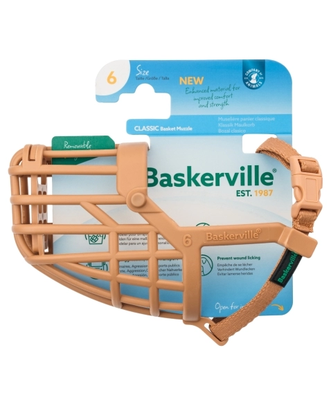 A Focinheira Clássica Baskerville foi criada usando um material aprimorado de borracha termoplástica (TPR), que é mais leve do que o design clássico de plástico, mas 4 vezes mais forte e com maior durabilidade. Esse material exclusivo permite que a focinheira seja remodelada para um ajuste personalizado em água quente. A Focinheira Baskerville Classic Basket vem com uma inserção de proteção adicional para evitar que o cão pegue alimentos e animais selvagens em caminhadas, coma pedras, coprofagia e lamba feridas após a cirurgia. O design da cesta garante o bem-estar do cão, permitindo que ele ofegue, beba e brinque. Com uma peça de nariz acolchoada aprimorada e uma alça de pescoço segura e fácil de ajustar, todos os cães podem se sentir confortáveis usando a focinheira, mantendo os donos felizes e confiantes em todas as situações. Possui, em sua ponta, um pequeno painel deslizante que deve ser deixado na focinheira para evitar que o cão coma algo indevido, durante um passeio ou no ambiente que fica, ataque pequenos animais ou consiga comer fezes. Caso este não seja o problema do cão, basta empurrar para trás e deslizar para cima e remover este painel. Isso permitirá que o cão coma alimentos e petiscos.