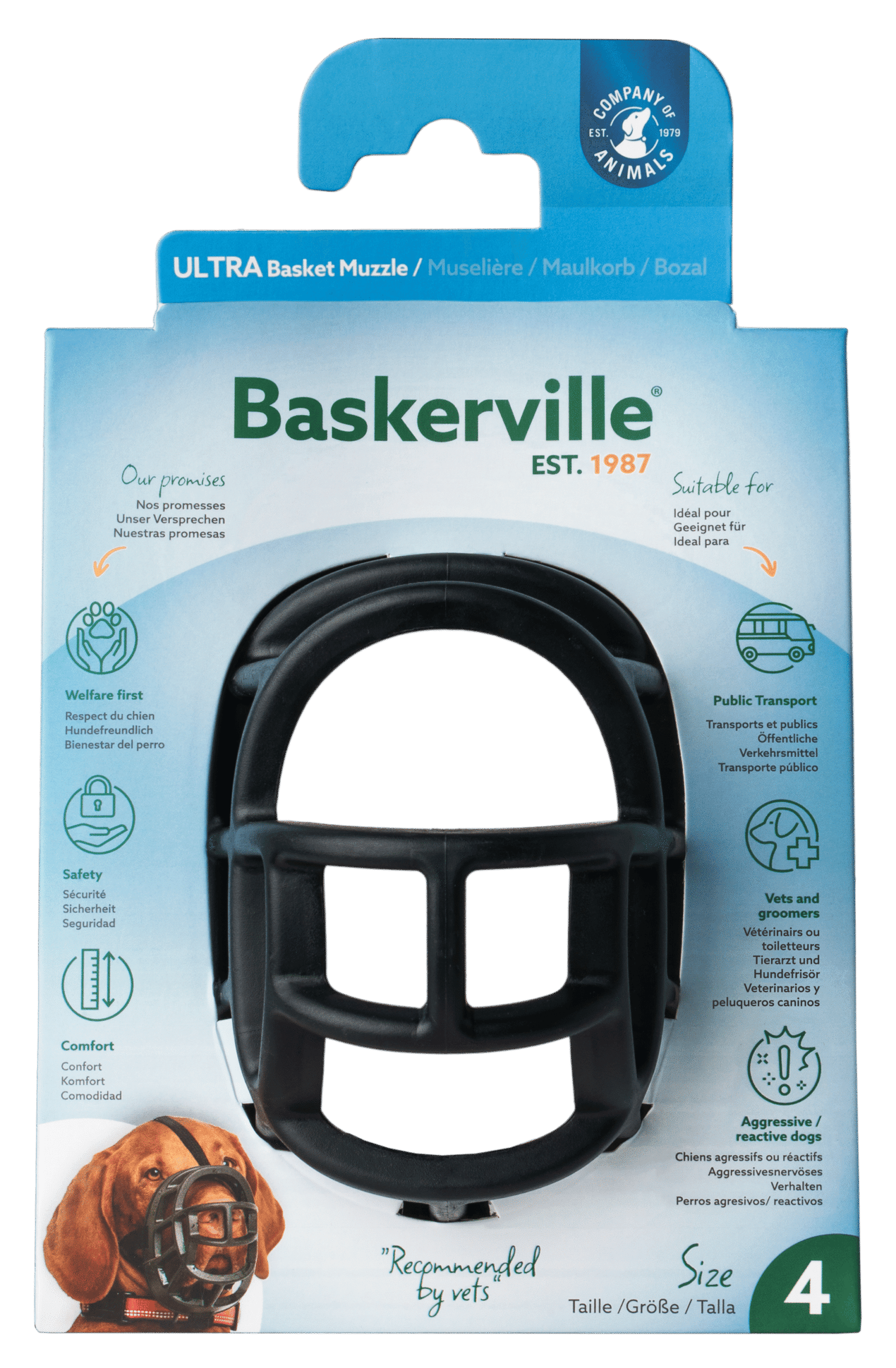 Baskerville permite que seu cão tenha conforto e liberdade durante o uso. Elimina os riscos de mordida em situações de estresse como veterinário, banho ou tosa, ataque a outros cães, etc, sem causar desconforto, estresse ou dor. O cão pode beber água, comer petiscos, arfar sem limitações.