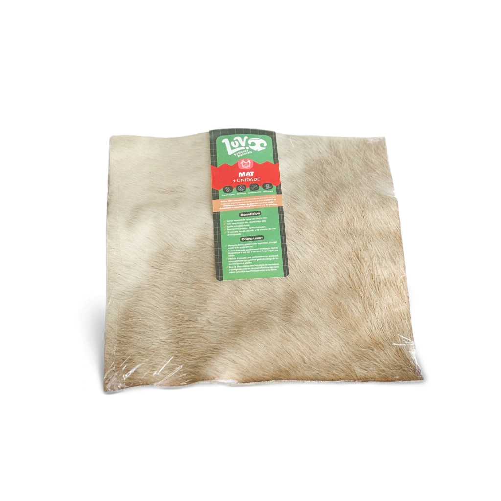 O ‘Mat’, que significa ‘tapete’ em inglês, recebe esse nome porque é feito de pele bovina, incluindo os pelos, aberta em formato quadrado. Isso torna a brincadeira mais desafiadora, já que o cão não terá uma base favorável para iniciar o rói, rói.