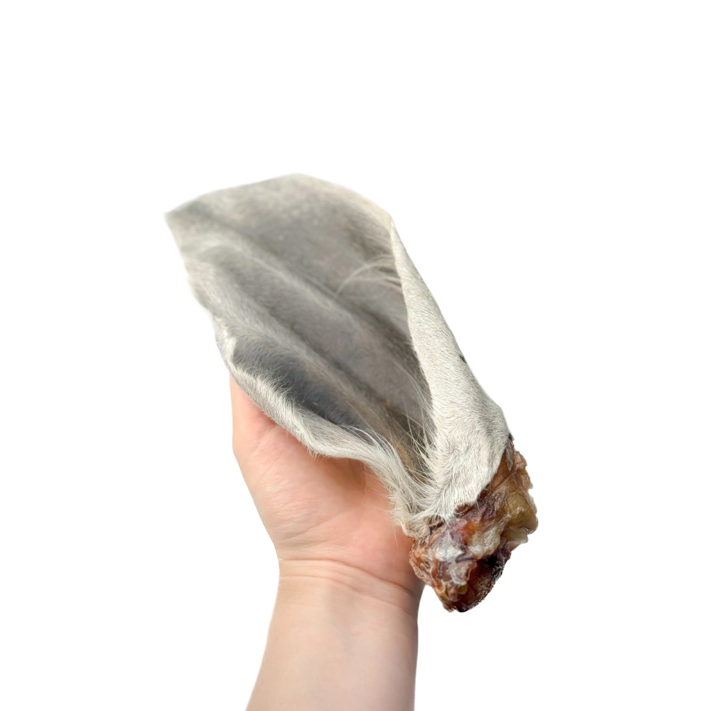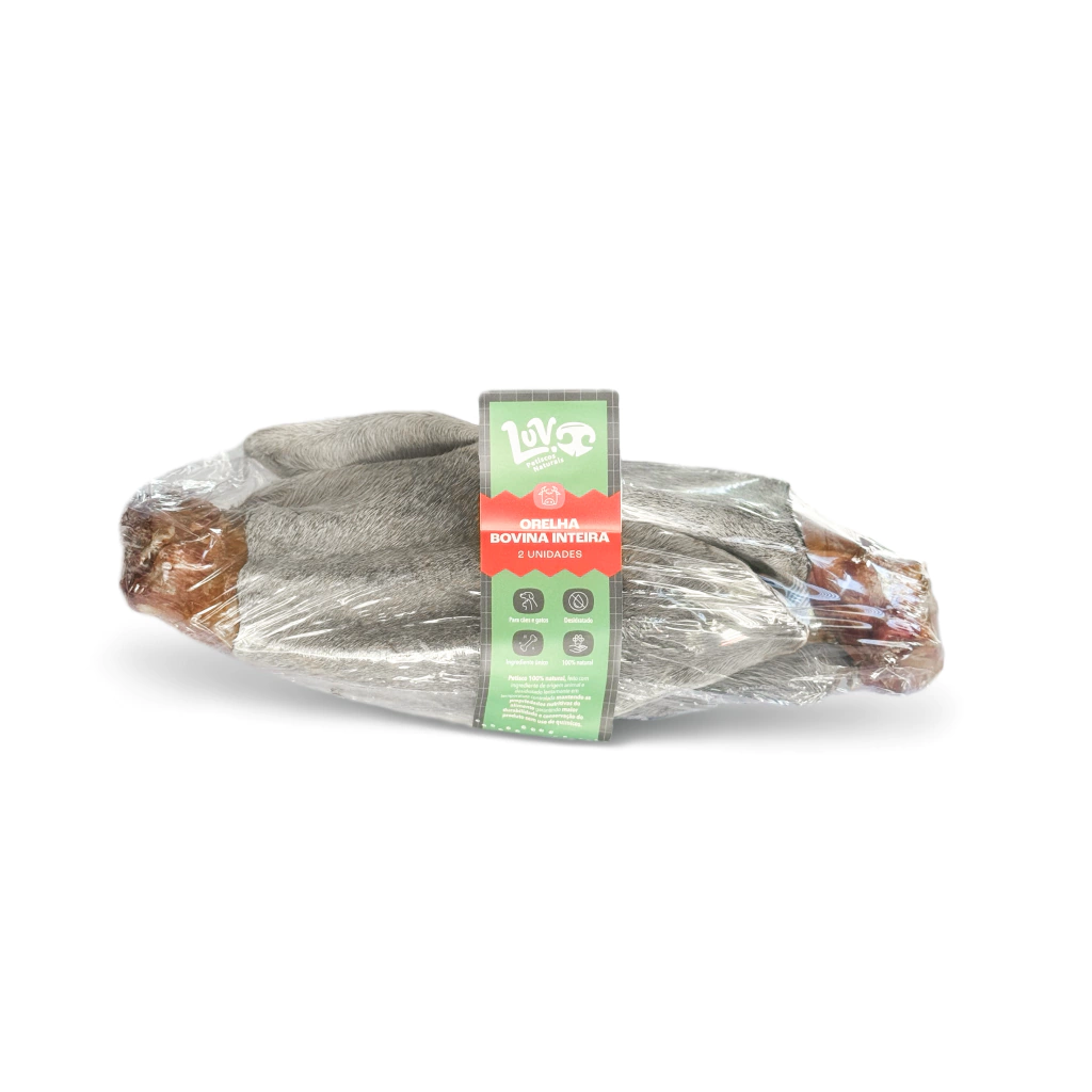 Este mastigável, de rigidez moderada, possui uma aparência impactante, pois é feito a partir das orelhas de bovinos, incluindo pelos, por isso é recomendado oferecê-lo com menos frequência, de preferência em ambientes externos. Ao entrar em contato com a saliva, pode apresentar um aroma característico de “boi no pasto”.