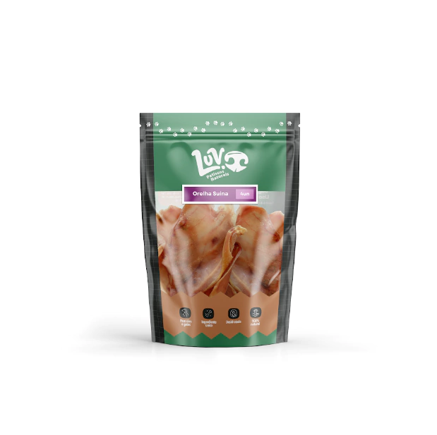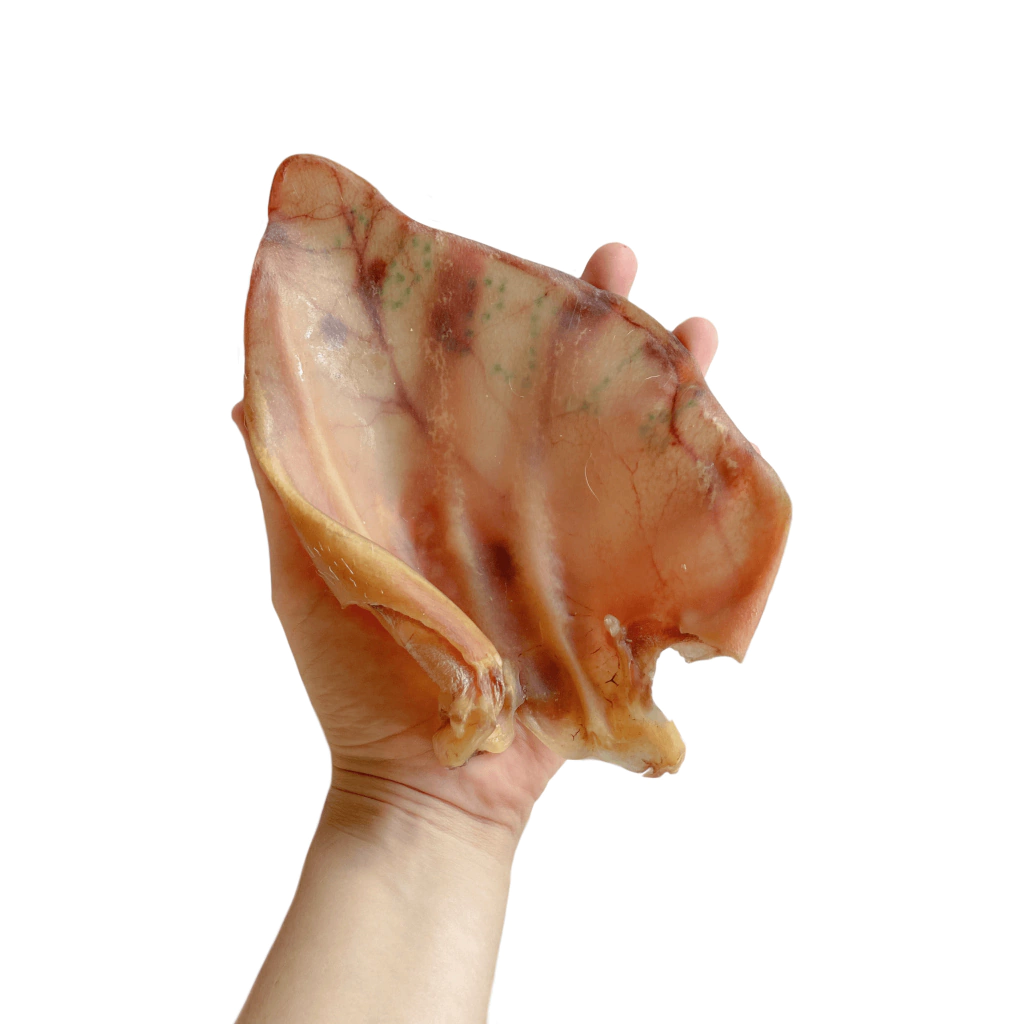 Este mastigável, de baixa rigidez, possui uma aparência impactante, pois é feito a partir das orelhas de porcos.