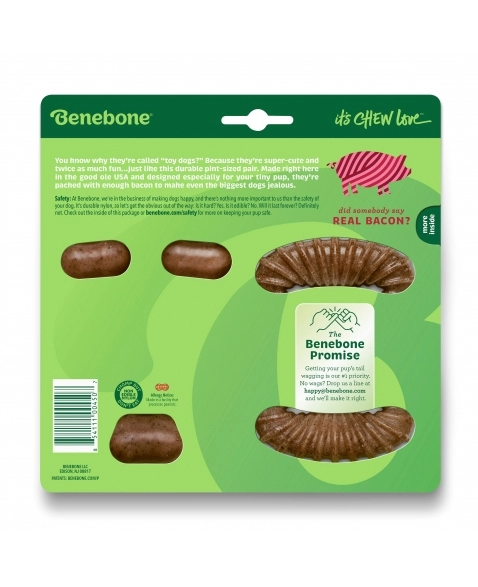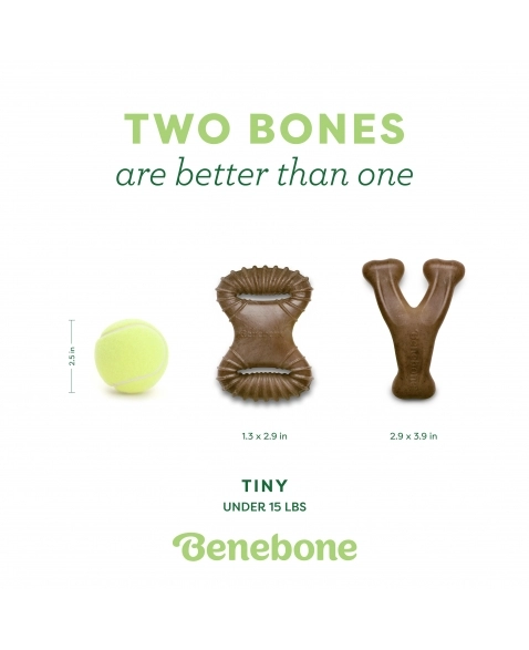 Dental Chew: O Benebone Dental Chew é um brinquedo que possui um formato arredondado com ranhuras e ergonômico, desenvolvido especialmente para cães com o objetivo de levar atração para o seu animal bem como facilitar a esfregação dos dentes evitando placas de tártaro e consequentemente ter uma melhora no hálito, porém não substitui a escovação diária. Composto por uma mistura de nylon atóxico e bacon natural. O Benebone Dental Chew é rígido, não é comestível e muito menos indestrutível.